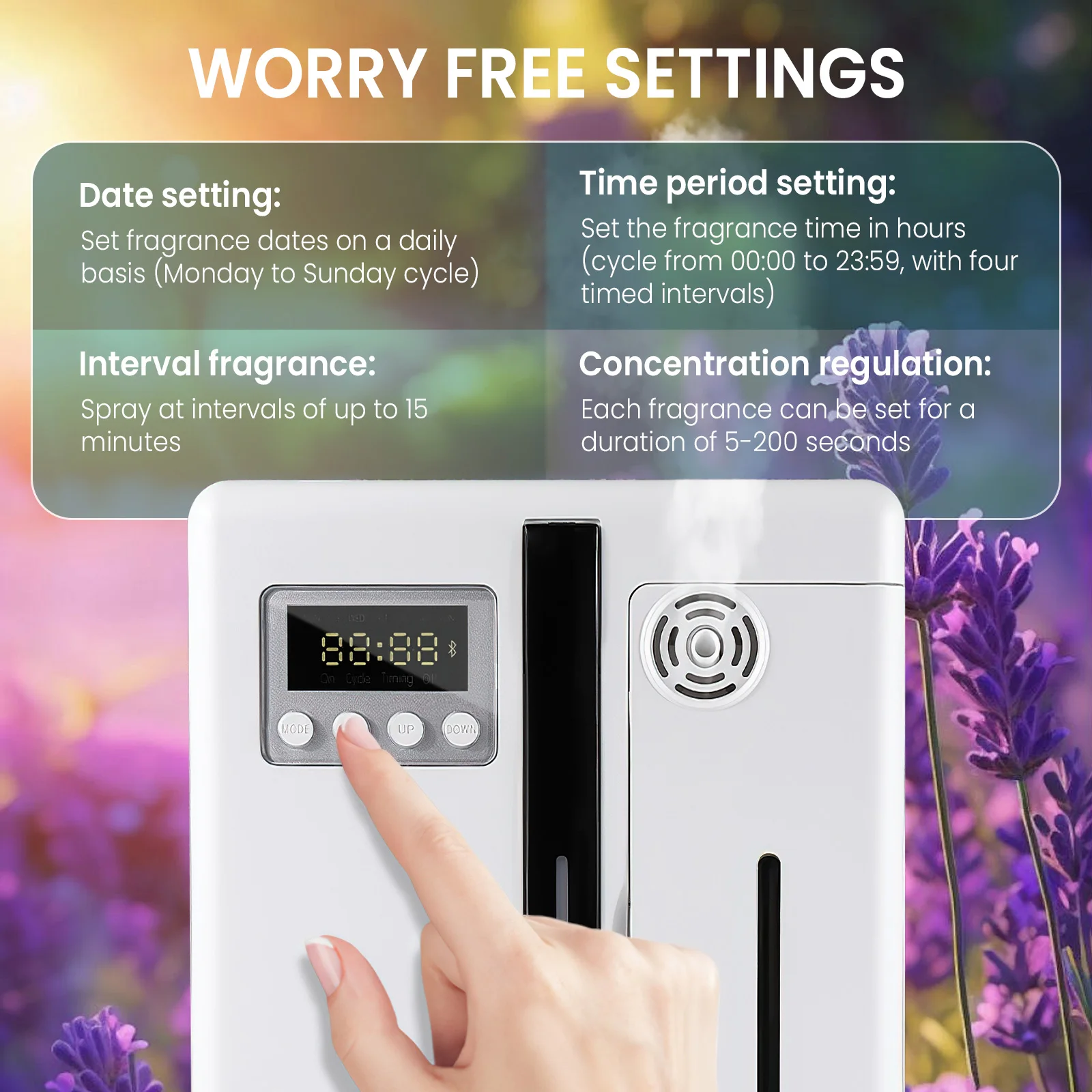 Datums einstellung: Stellen Sie das Duft datum in Tage ein, mit einem Zyklus vom Montag bis zum Sonnen tag. Zeitschlitz einstellung: Stellen Sie die Duftzeit in Stunden ein, mit einem Zyklus von 00:00 zu 23:59 und vier zeit gesteuerten Intervallen,